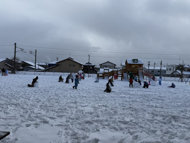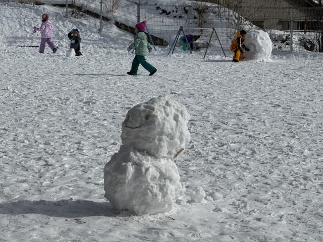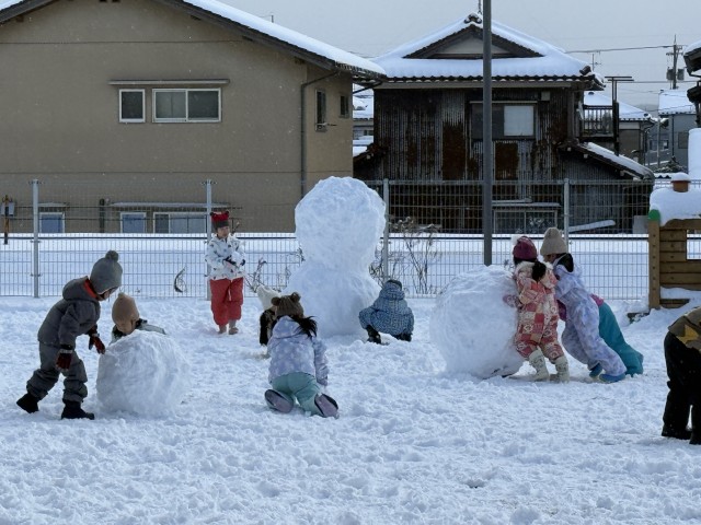園庭に雪が積もり雪遊びを楽しんだ子ども達です。青組さんはさすが年長さん!大きな雪だるまをみんなで協力して作り上げていました。大きな雪だるまに小さいお友達も大興奮でした♪