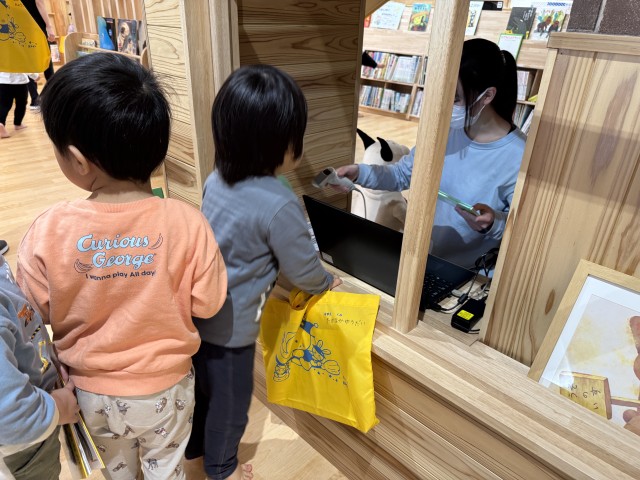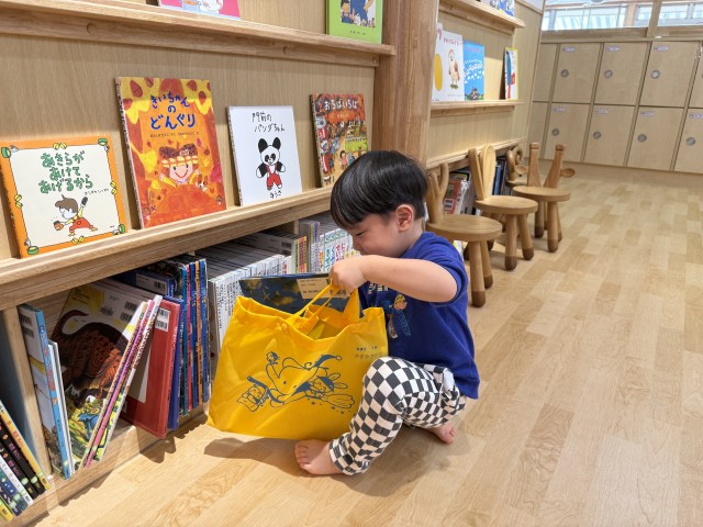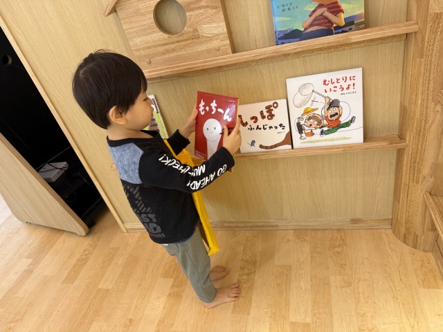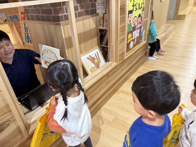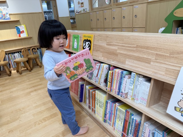 赤組さんが初めて絵本の森で絵本借りをしました。初めての雰囲気に嬉しそうに絵本を選んで借りていた赤組さんでした♪