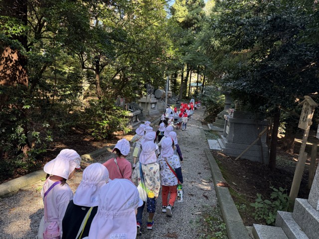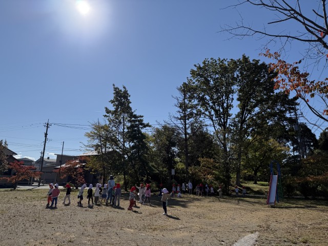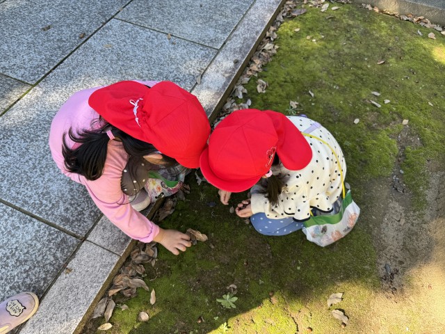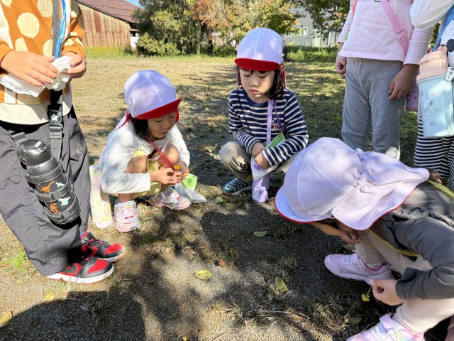 秋空の下お散歩に行ってきた4歳児緑組。お散歩バックをかけて秋を探してきました。ついた公園や神社には、松ぼっくりやどんぐり、落ち葉などたくさんの秋がかくれんぼしていました。お散歩バックいっぱいに秋を詰め込んでお散歩を楽しんできました♪