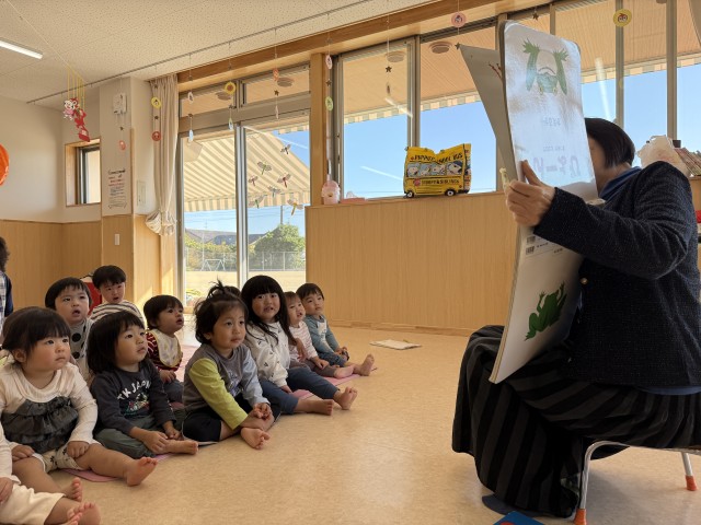 いつもと違う雰囲気で担任以外の読み聞かせを聞くおはなしわくわく♪1歳児の桃組のお部屋に今月は園長先生が来てくれました。集中してお話を聞いていた子ども達でした!来月はまた、違うお部屋の先生が読み聞かせしてくれます!