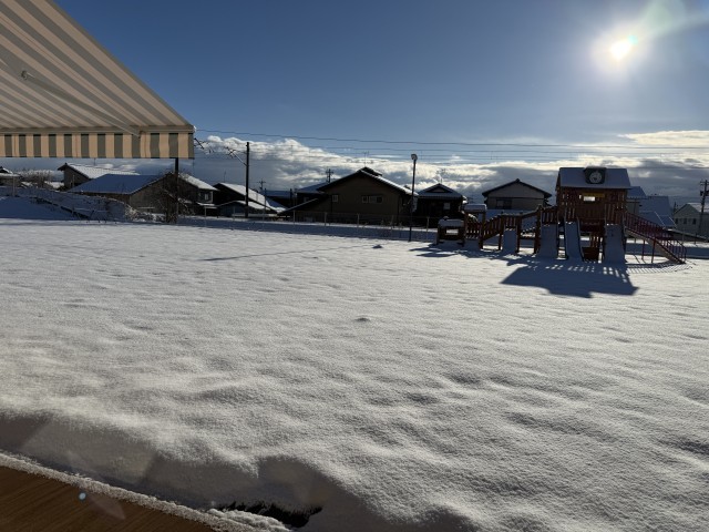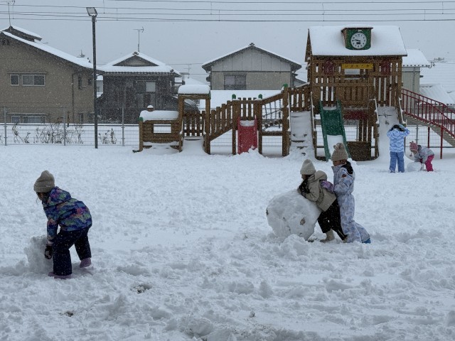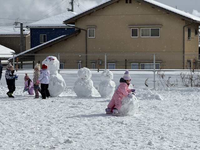 園庭に雪が積もり雪遊びを楽しんだ子ども達です。青組さんはさすが年長さん!大きな雪だるまをみんなで協力して作り上げていました。大きな雪だるまに小さいお友達も大興奮でした♪