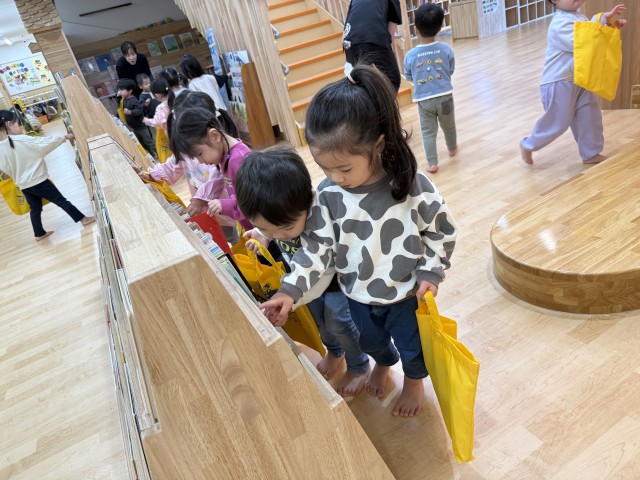 赤組さんが初めて絵本の森で絵本借りをしました。初めての雰囲気に嬉しそうに絵本を選んで借りていた赤組さんでした♪