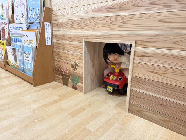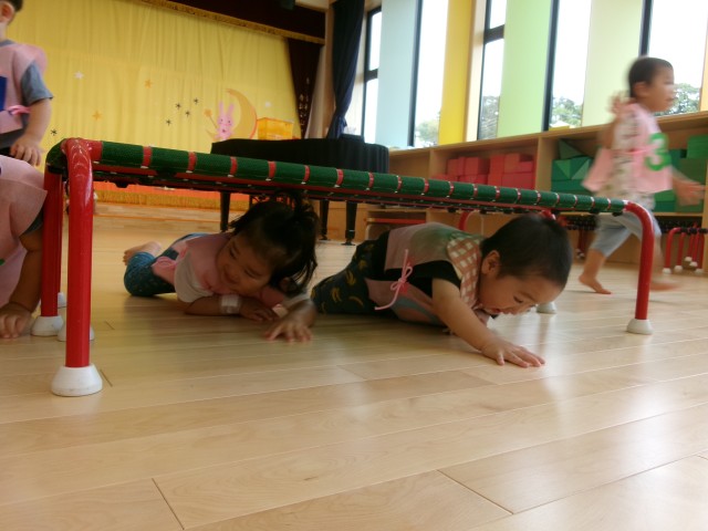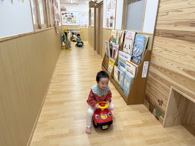 コンビカーを出すと大喜び!廊下を楽しそうにドライブしています。あ、絵本の森に小さなトンネルが!?上手に腰を低くしてトンネルをくぐっていく小さなドライバーさん達でした♪