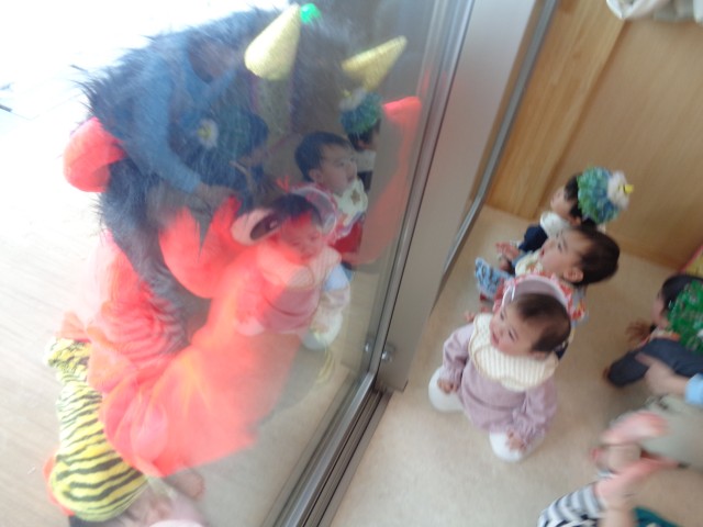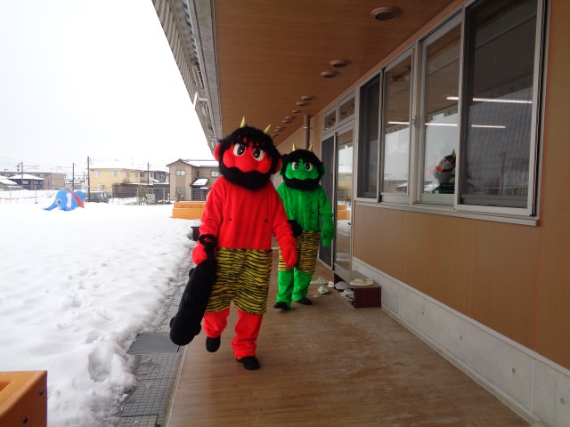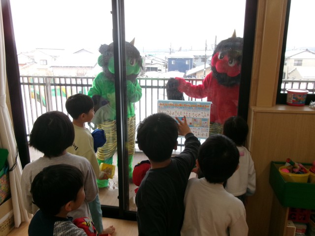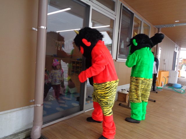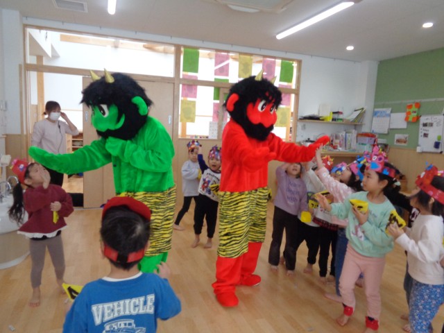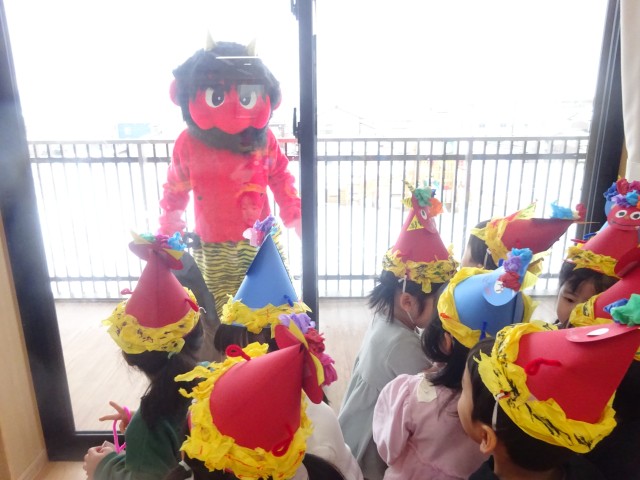 新園舎になったので鬼も場所が分からないだろうと安心していた子ども達でしたが、ベランダに鬼の姿が…。泣いている子もいましたが、今年も元気いっぱい豆まきをすることができました!