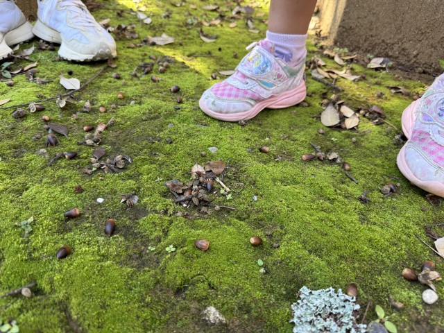 秋空の下お散歩に行ってきた4歳児緑組。お散歩バックをかけて秋を探してきました。ついた公園や神社には、松ぼっくりやどんぐり、落ち葉などたくさんの秋がかくれんぼしていました。お散歩バックいっぱいに秋を詰め込んでお散歩を楽しんできました♪