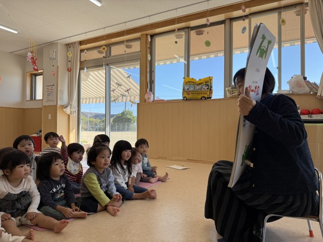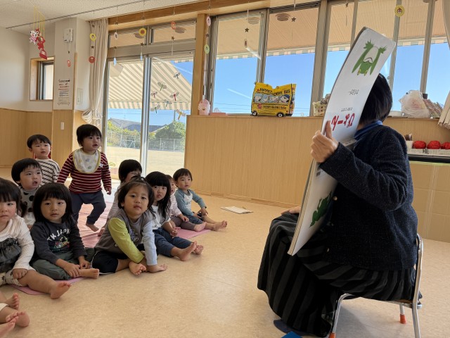いつもと違う雰囲気で担任以外の読み聞かせを聞くおはなしわくわく♪1歳児の桃組のお部屋に今月は園長先生が来てくれました。集中してお話を聞いていた子ども達でした!来月はまた、違うお部屋の先生が読み聞かせしてくれます!